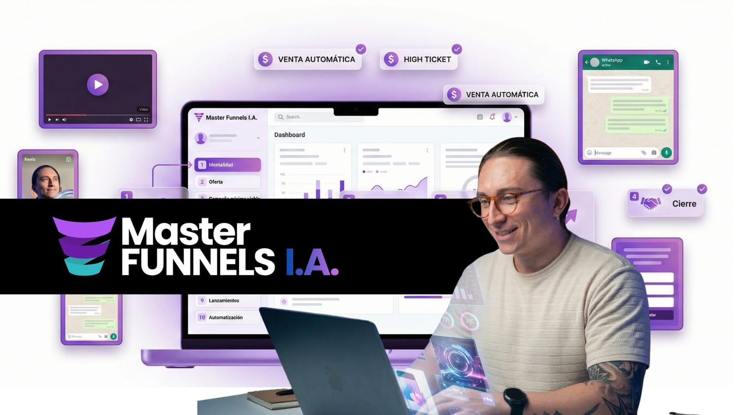 MasterFunnels I.A. es el programa donde te enseño a replicar el mismo sistema de marketing, ventas y automatización que uso para vender en más de 30 países, monetizar mi conocimiento y vivir viajando.
