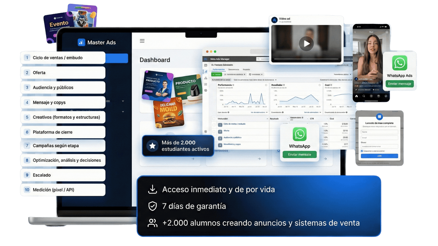 MasterAds no es solo teoría, es un programa completo con sesiones en vivo, soporte personalizado y recursos prácticos como guías y plantillas que te ayudarán a implementar lo aprendido.